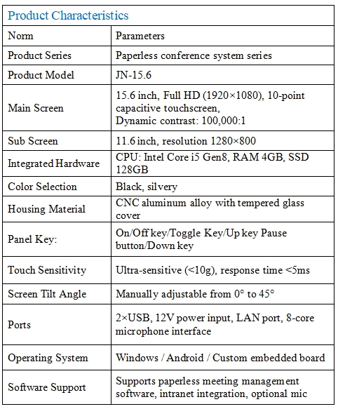 यह डेस्कटॉप टर्मिनल, जिसमें 15.6 इंच का मुख्य टचस्क्रीन और 11.6 इंच की बैक स्क्रीन है, जो मीटिंग दक्षता, सुरक्षा और इंटरैक्शन को बढ़ाने के लिए डिज़ाइन की गई एक व्यापक पेपरलेस कॉन्फ्रेंस सिस्टम का हिस्सा है।