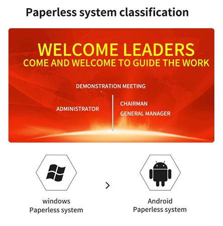 पेपरलेस ऑफिस कॉन्फ्रेंस सिस्टम एक पेपरलेस कॉन्फ्रेंस सिस्टम है जो सरकारी एजेंसियों, उद्यमों, संस्थानों और बड़ी समूह कंपनियों के लिए तैयार किया गया है। यह प्रतिभागियों को एक अत्यंत सुविधाजनक और व्यावहारिक सम्मेलन मंच प्रदान करता है, और सम्मेलन की लागत को कम करने, सम्मेलन दक्षता में सुधार, सम्मेलन सुरक्षा सुनिश्चित करने और सम्मेलन की गुणवत्ता में सुधार के अंतिम लक्ष्य के साथ एक नया सम्मेलन मोड है।